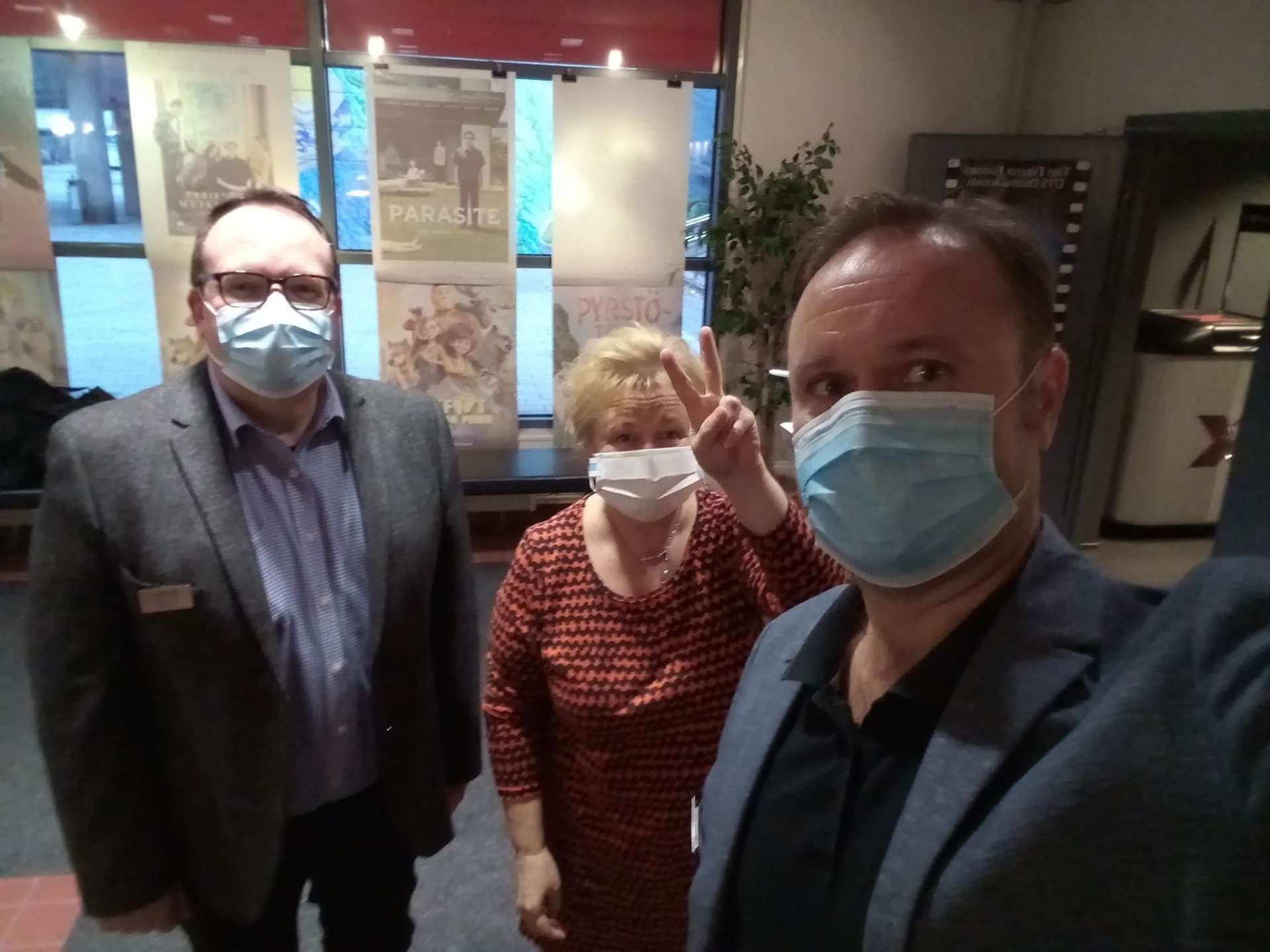 OAJ pääkaupunkiseudun alueyhdistyksen YSI- ja OAO-jaostojen elokuvailta ja kuntavaalistartti Vantaalla Kino Myyrissä 5.10.2020. Kuvassa vasemmalla OAO-jaoston puheenjohtaja toivo Heikkilä, keskellä Ulla Kaukola Vantaan kaupungin hallituksen jäsen ja OAJ valtuutettu sekä oikealla YSI-jaoston puheenjohtaja Antti Piiroinen.
