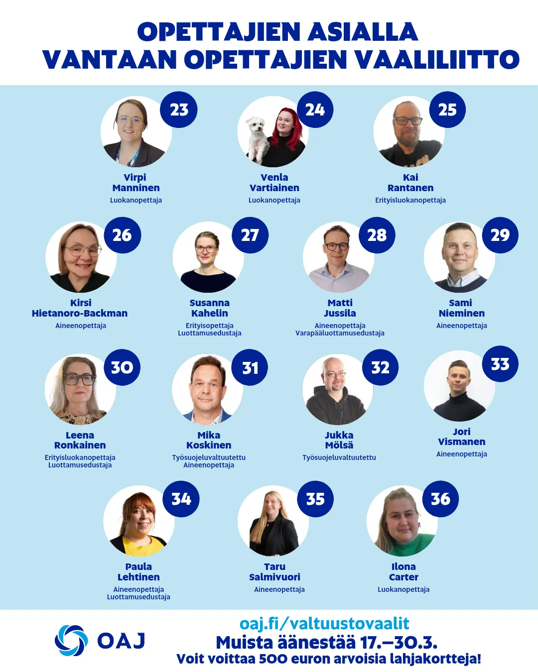OAJ:n vaalikoneessa: https://www.oaj.fi/oaj/osallistu-toimintaan/oajn-valtuutettu/vaalikone/#/DISTRICT_cmQgG4pJQzCZ9QdWFY3CCX/ehdokkaat